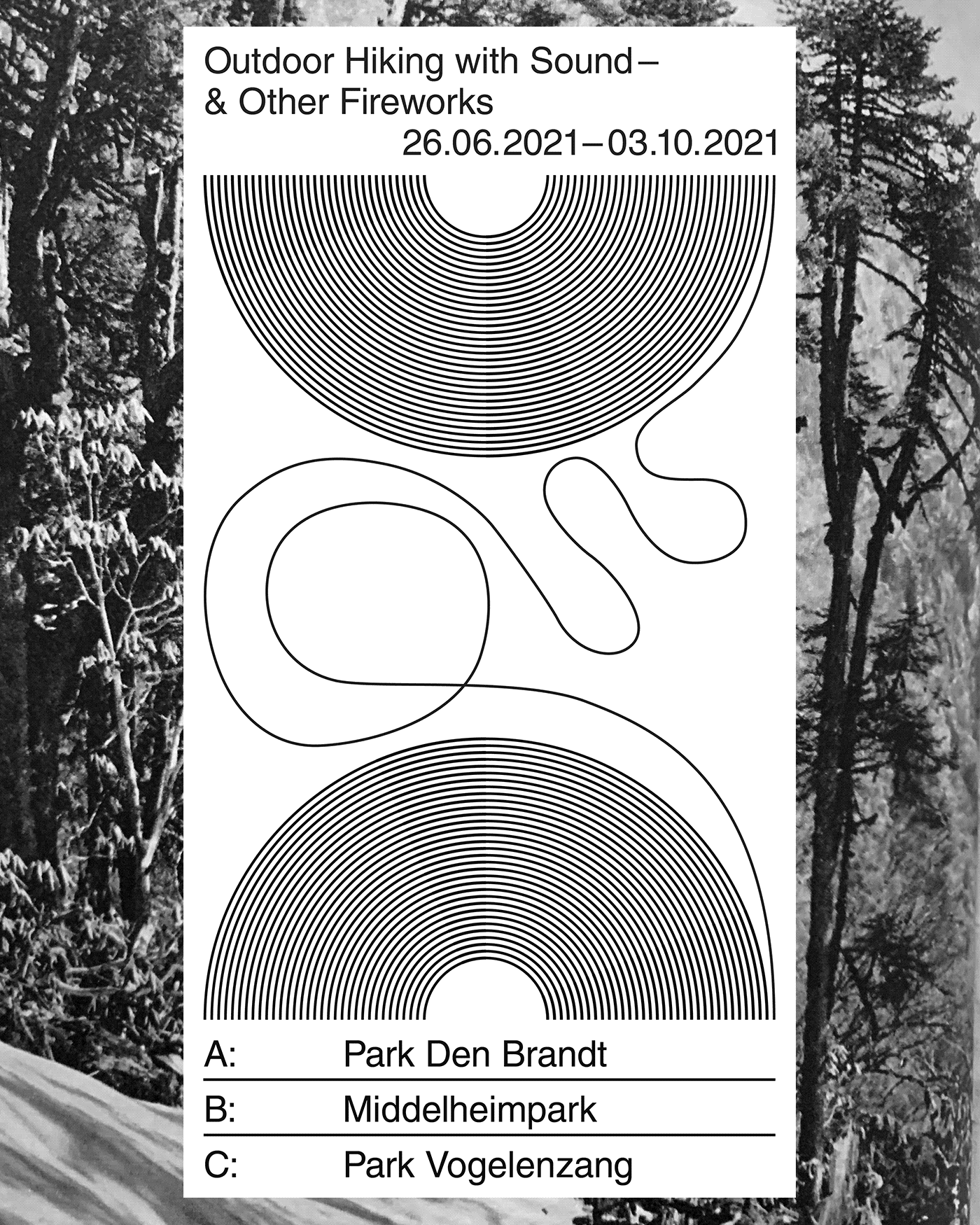 Visuele identiteit, website en signalisatie voor Outdoor Hiking, een tentoonstelling als audiowandeling waarbij kunstenaars audiowerk maakten bij beelden en locaties in het Middelheim Museum, Den Brandt en Vogelenzang.